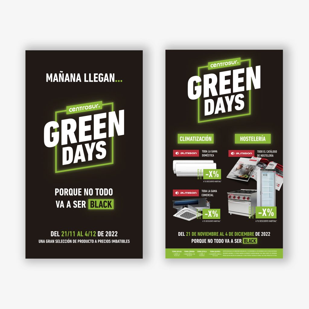 PARA ELLO LE DIMOS UNA VUELTA TANTO AL NOMBRE DE LA CAMPAÑA COMO AL ESLOGAN: "GREEN DAYS, PORQUE NO TODO VA A SER BLACK". QUERIAMOS DARLE UN ENFOQUE DISTINTO AL HABITUAL Y DIFERENCIARNOS DE LA COMPETENCIA, SIN DEJAR ATRÁS EL CORPORATIVISMO Y NUESTRO ESTILO. LA IDEA ERA ASOCIAR LA PROMOCIÓN AL BLACK FRIDAY (A TRAVÉS DE LOS COLORES) PERO SIN SERLO (A TRAVÉS DEL MENSAJE).